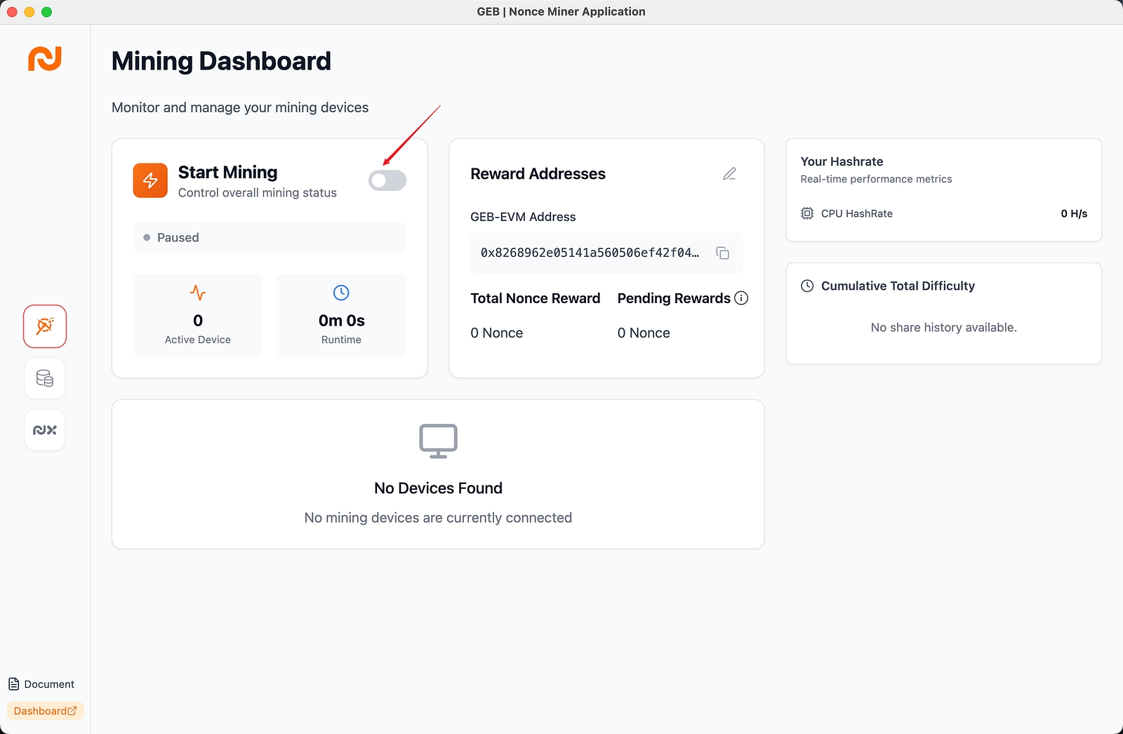 You’ll see your device's working status, runtime, hashrate performance, and shares.