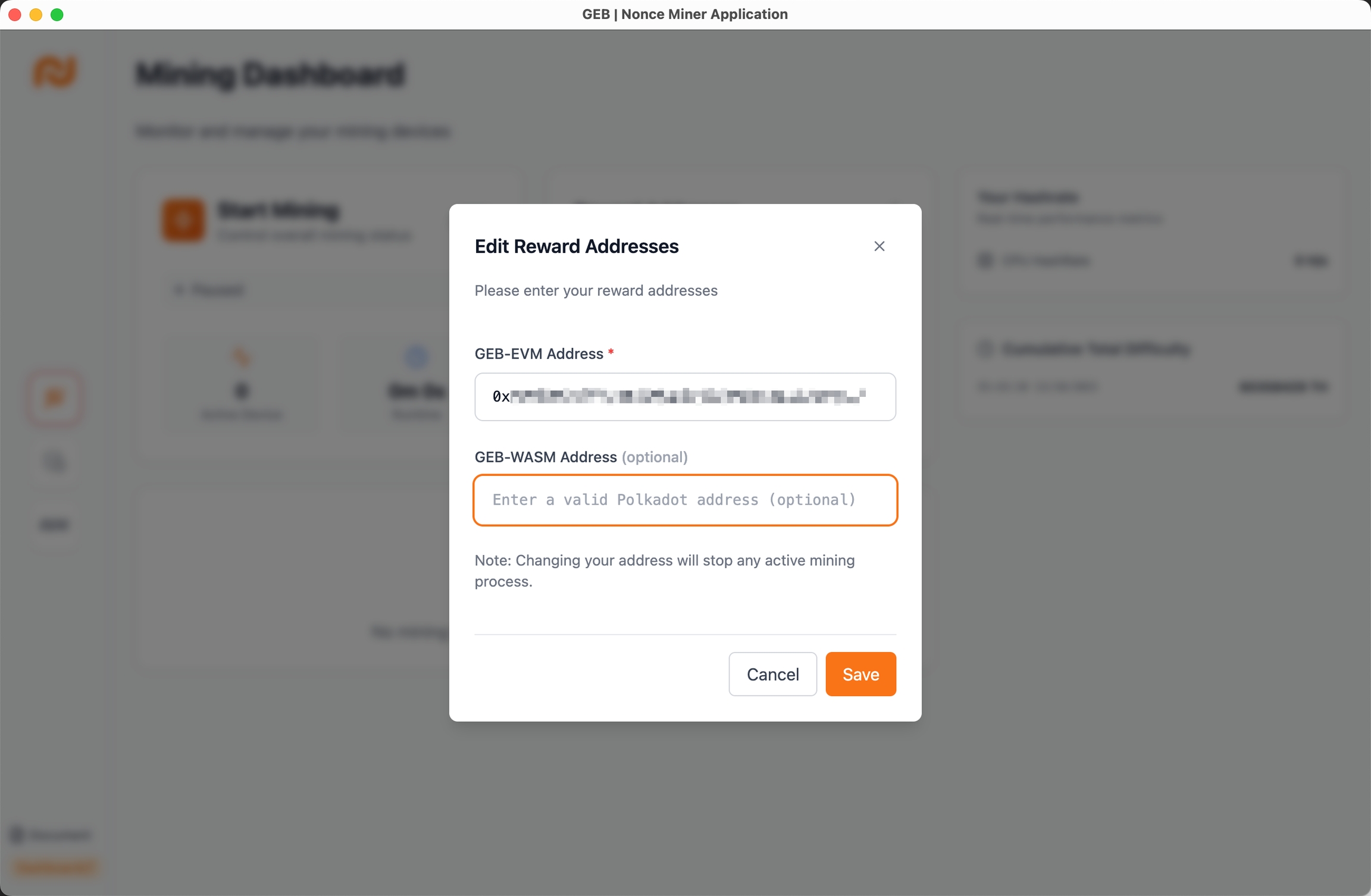 The WASM address is optional, but it’s necessary to create one. When the mainnet goes live, the top 256 miners of each agere will receive $GEB rewards at this address.
